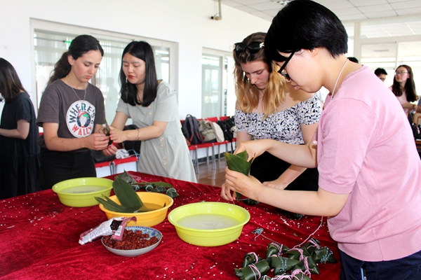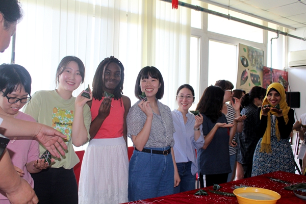 活动室里弥漫着清新粽香,充满了欢声笑语。来自意大利、葡萄牙、俄罗斯、埃及、泰国、土耳其、苏丹等十余个国家的近百名留学生欢聚一堂,跟着“中国师傅”学习包粽子、编五彩绳,体验中国传统文化,共庆端午佳节的来临。