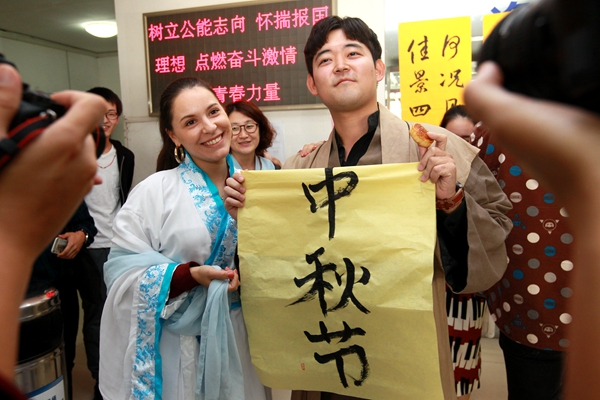 2017年中秋节文化体验活动在南开园里热闹上演。学书法、品月饼、送祝福……来自意大利、俄罗斯、韩国、埃及、葡萄牙、亚美尼亚等国家的留学生与中国学生欢聚在学院南楼,喜迎中秋节,共话“中华情”。