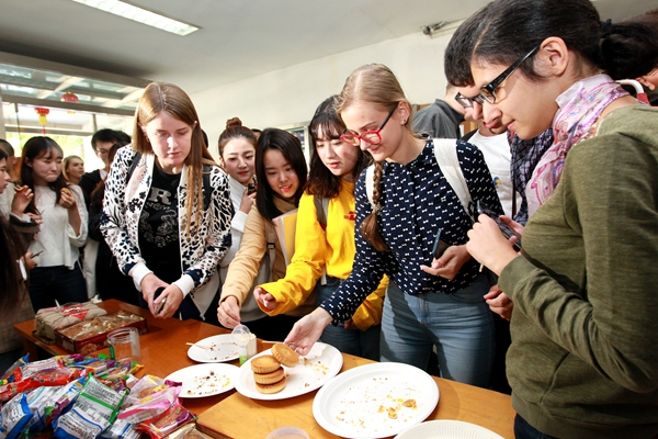 在活动大厅里,五仁、蛋黄、莲蓉、百果、豆沙、水果等各种口味的月饼摆满了桌子,圆圆的形状、金黄的光泽吸引了不少学生前来聚集。“这是我第一次吃月饼,感觉很不错,像甜点一样。”来自葡萄牙的谢婉婷情不自禁地竖起了大拇指。“我最喜欢豆沙的味道,很香,甜得恰恰好,刚下课就吃到好吃的月饼,感觉非常开心。”亚美尼亚留学生薛云高兴地说道。