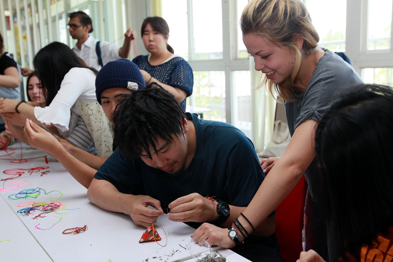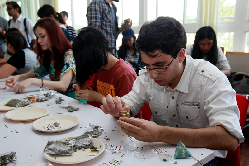除了包粽子以外,旁边桌上的做香囊和编彩线活动也让留学生们觉得兴奋不已。潘安东是一名来西班牙的中级进修生,对做香囊“情有独钟”,“我到中国旅行时有看到商店在卖香囊,今天自己亲手做,感觉很有意思。老师刚才介绍说,香囊里面的东西还有一些功效,我觉得很神奇。”