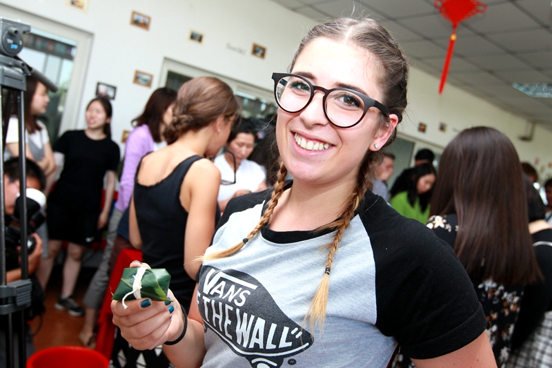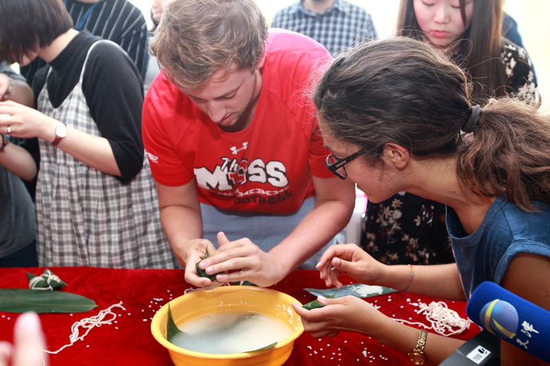 活动现场,学院特别邀请了专业教师前来指导学生如何包粽子。“我来了中国一年,吃过但从来没有自己包过粽子。”来自美国的司凯琳在老师的指导下拿着两片粽叶缠来绕去,总觉得动作别扭,但却乐此不疲。