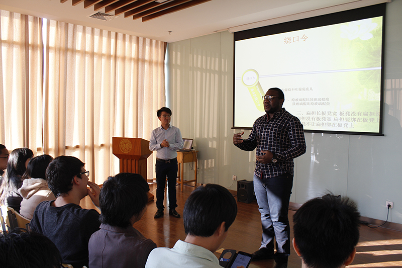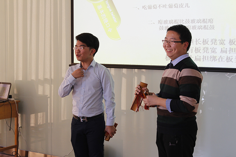 此次讲座邀请了著名相声演员李春熠、郭鸿斌、姜华等,为同学们讲授快板、相声等相关知识。讲座一开始,郭鸿斌先生就用一段悠扬的萧曲向大家展示了中华曲艺的博大精深,随后,他又为大家讲解了快板的相关知识,还带来了一段轻快的快板表演,赢得大家阵阵赞叹。紧接着,姜华从中外幽默文化对比方面为大家讲解了中国相声文化里包袱的由来,幽默且翔实的讲解让大家都获益匪浅。最后,李春熠先生就相声中的绕口令这一知识为大家进行了生动活泼的介绍,“吃葡萄不吐葡萄皮”“扁担宽板凳长”等中国人耳熟能详的绕口令让在场的留学生跃跃欲试,各国留学生还向大家展示了自己国家的绕口令,令现场气氛达到高潮。最后,李春熠和郭鸿斌一起为大家带来了一段相声,结束了当天的讲座。