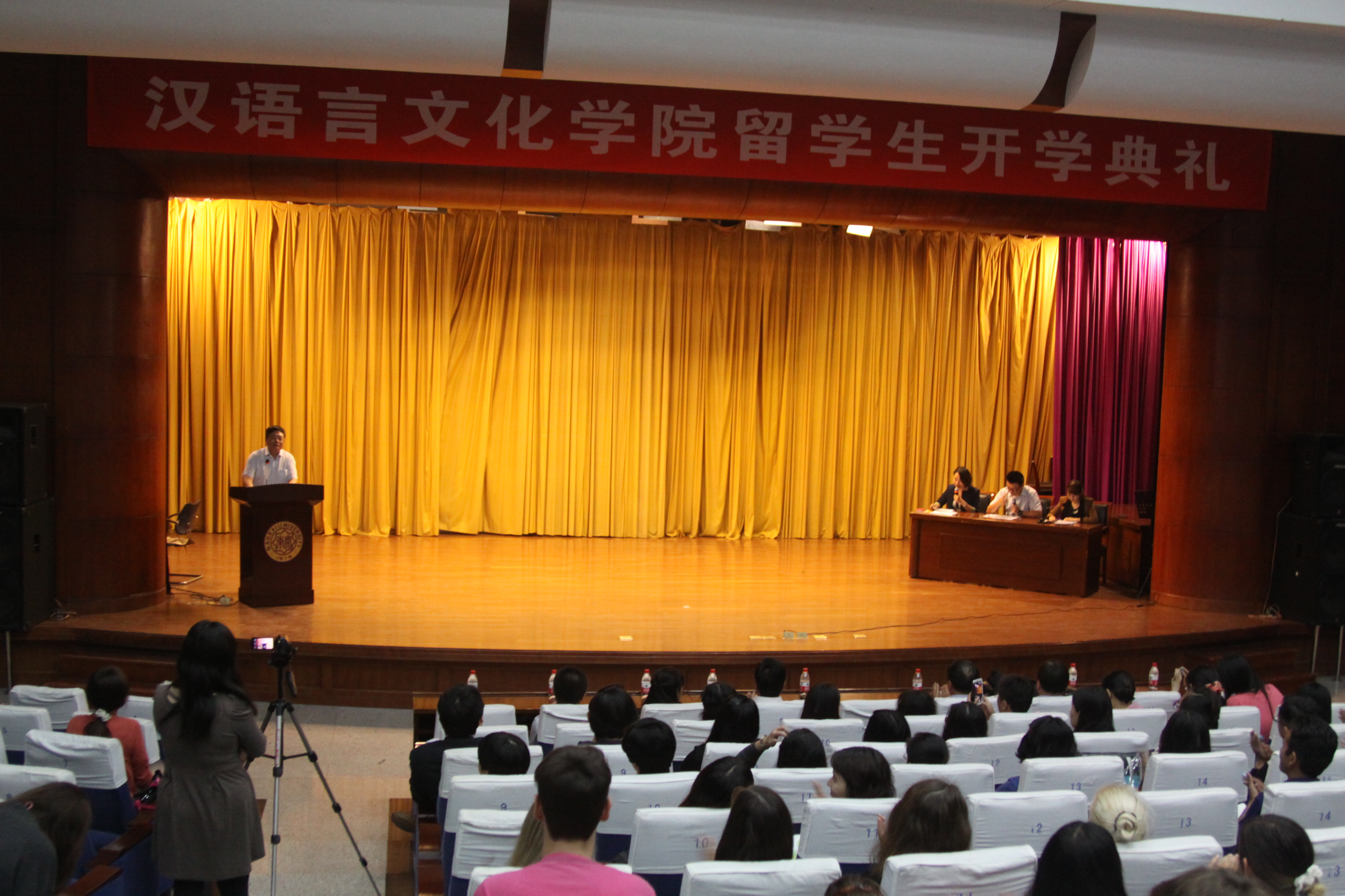 在激昂优美的校歌中,开学典礼拉开了帷幕。院长王立新对留学生的到来表示了欢迎。他介绍了老司机论坛 汉语教学的悠久历史以及老司机论坛 优秀的师资力量和高效、务实的教学方法,鼓励留学生们利用学院搭建的平台学好汉语,入乡随俗,成为真正的“中国通”。