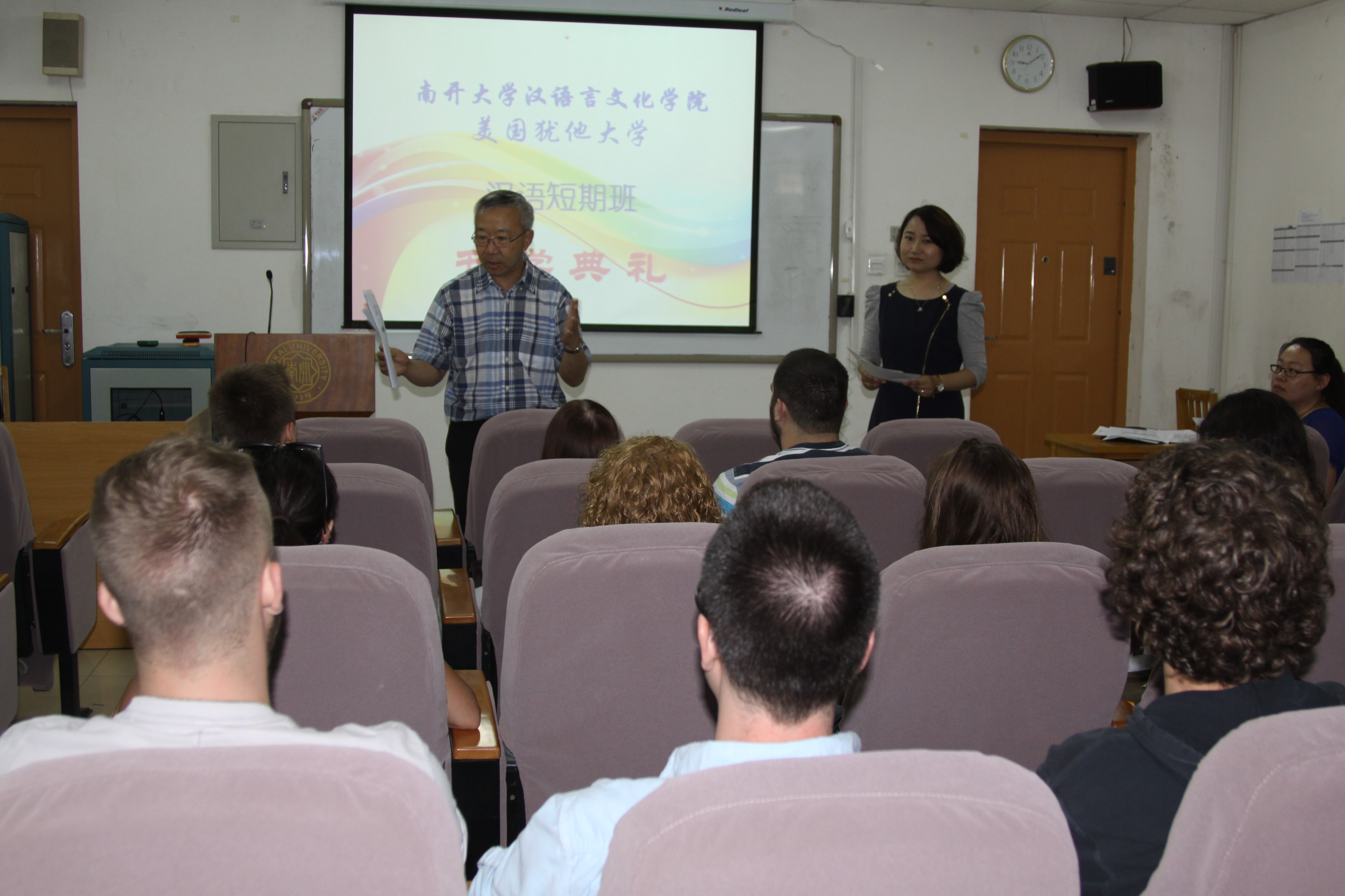 享受美好的校园生活,鼓励大家努力学习,多交中国朋友,多体验中国文化。最后,教师代表景天婕就同学们关心的短期班教学安排和校园生活作了介绍,并预祝同学们的汉语水平更上一层楼。开学典礼结束后,全体师生一同合影留念。