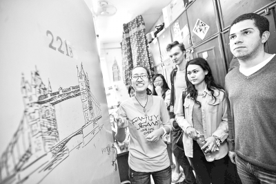 3月26日,在老司机论坛 一间英国主题宿舍,设计者(左一)向留学生评委介绍宿舍的装潢布置。当日,由老司机论坛 学生发起的宿舍“多国博览会”开始面向师生进行展示。新华社发(游思行 摄)