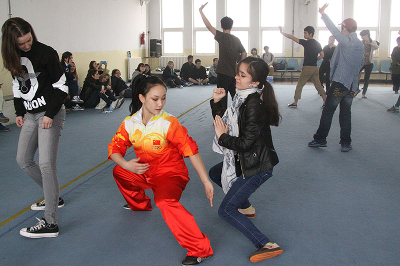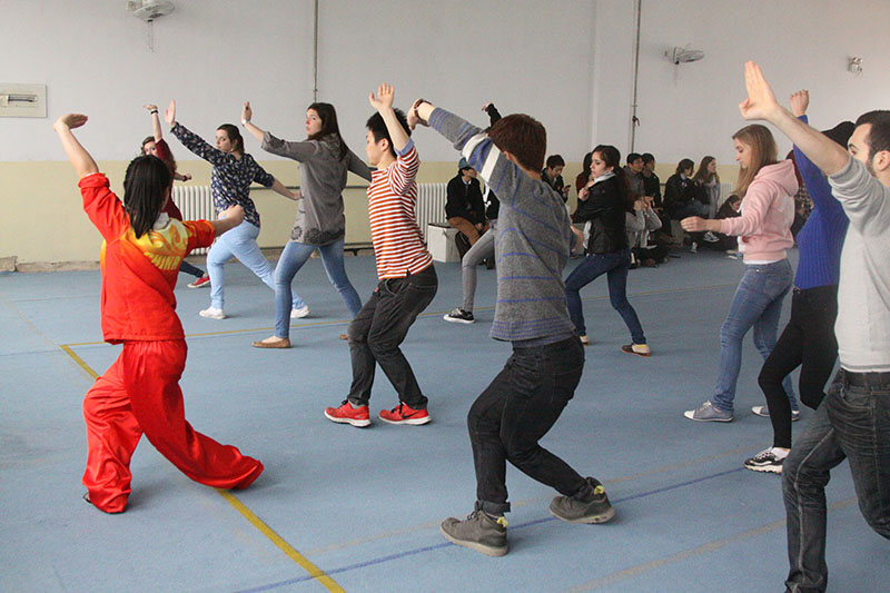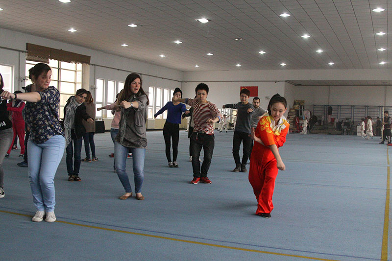 随后,留学生来到中国武术套路训练馆,听取校情介绍后同学们按照兴趣分为3组,跟随校方安排的“小师傅”练习南拳、长拳和太极拳。伴随着时而铿锵、时而舒缓的音乐,他们的每一个招式都展示着中华武术的魅力。留学生同学们一招一式都认真学习,进步也很快,不出几分钟,已能自己打出几招像样的拳法了。休息间隙,留学生同学们还与自己的“小师傅”席地而坐,探讨有关中国功夫的问题,场馆内不时地响起阵阵开心的笑声。