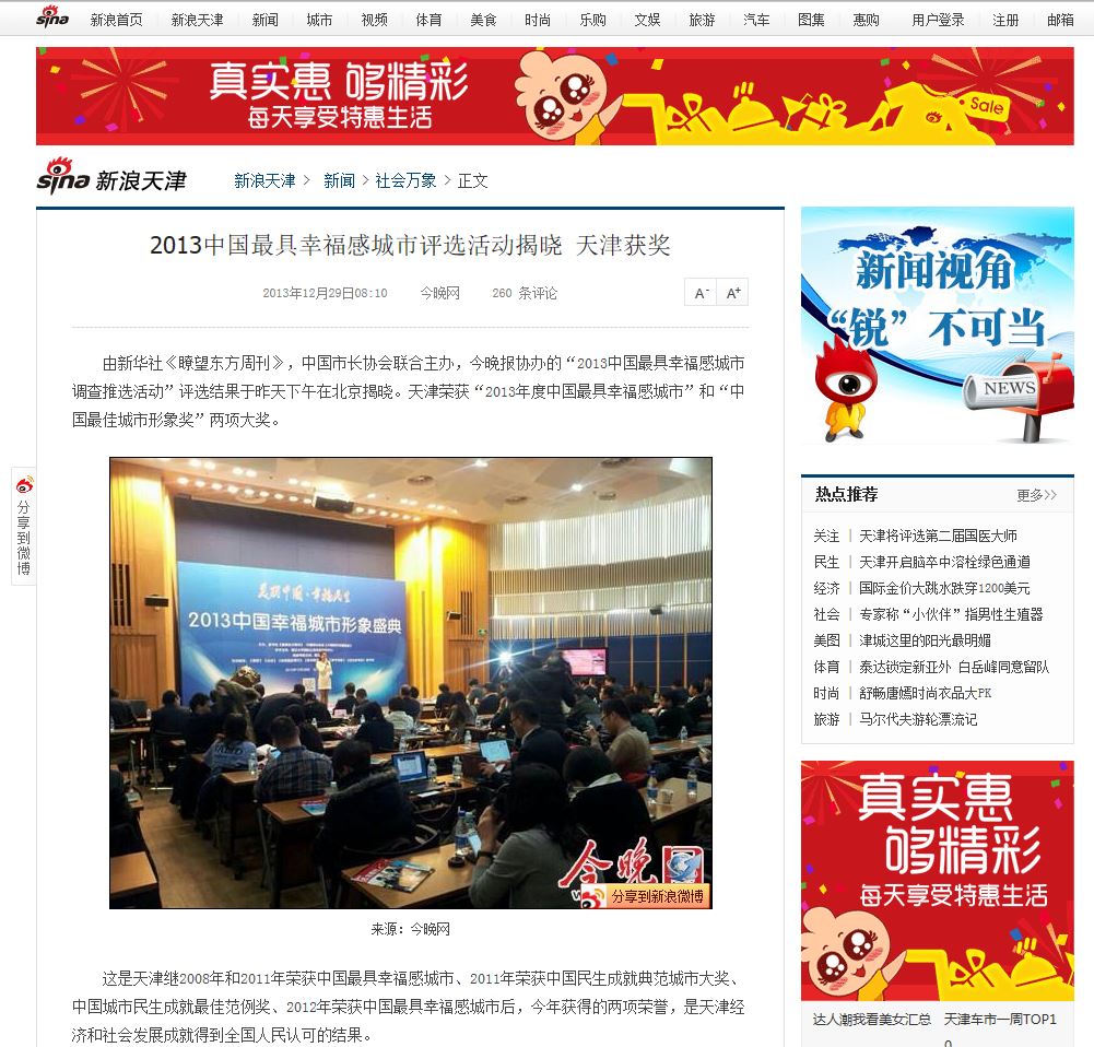 这是天津继2008年和2011年荣获中国最具幸福感城市、2011年荣获中国民生成就典范城市大奖、中国城市民生成就最佳范例奖、2012年荣获中国最具幸福感城市后,今年获得的两项荣誉,是天津经济和社会发展成就得到全国人民认可的结果。