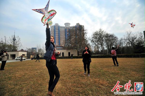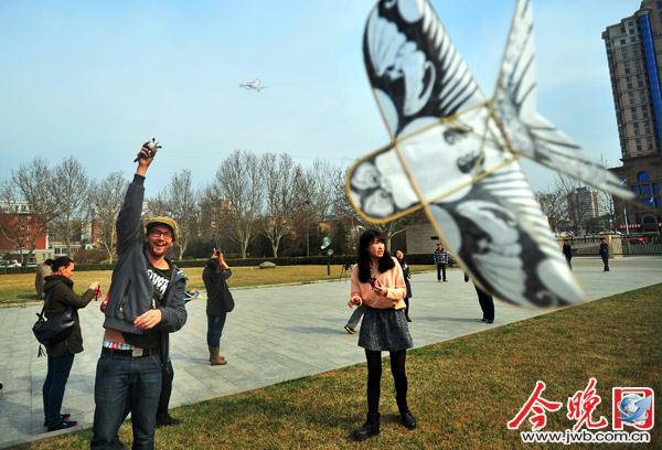 广场上,留学生们放飞自己制作的小风筝。渤海早报记者游思行通讯员马超摄