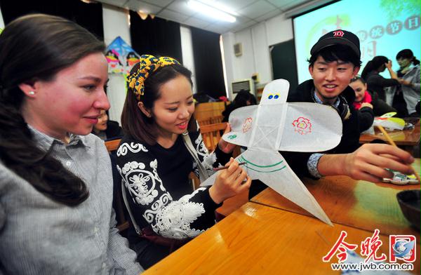 图为留学生们在民间艺人的指导下,制作小风筝。渤海早报记者游思行通讯员马超摄