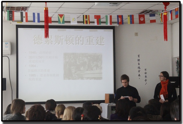 活动中,来自日本、韩国、意大利、波兰、西班牙、美国、俄罗斯和澳大利亚等国的百余名留学生身着民族服饰,载歌载舞,图文并茂地将本国或本民族的文化古迹、风土人情向来自世界各地的朋友们进行了展示。来自美国马里兰的吴允伦同学就向大家介绍了他的家乡马里兰的著名景点大洋城以及华盛顿哥伦比亚特区的特色之处,生动的图片和幽默的解说将活动的气氛逐渐引向热烈。来自俄罗斯组的同学们用航班飞行的形式带领大家从哈萨克斯坦的阿斯塔纳一路飞跃莫斯科、圣彼得堡、基辅,新颖的形式让大家眼前一亮。来自韩国的同学们深情地演唱了民族歌曲《阿里郎》,将对家乡的思念和热爱娓娓道来。而来自土耳其的同学们则现场表演了独具伊斯兰风格的民族舞蹈,充满异域风情的音乐和跳跃的舞步将气氛掀至高潮,雷鸣般的掌声不绝于耳……