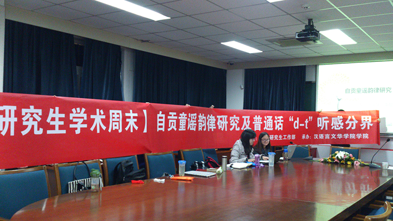 2012级硕士研究生李敏、付瑜两位同学分别作了《自贡童谣的韵律研究》和《普通话舌尖中塞音送气/不送气听感分界的初步实验》的学术报告。