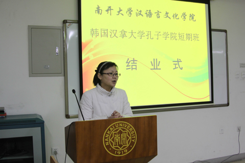 的短期留学表示祝贺。她希望同学们把友好的声音带回韩国,今后坚持学习汉语,将来为中韩两国的世代友好做出自己的贡献。李玲作为中方教师代表发言,她对同学们在考试中取得优异成绩表示赞许的同时,也提出老师们期望。