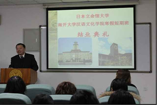 和立命馆大学有着很多年的友好交往,认识这么多届立命馆大学的同学我感到非常荣幸。”接着,他指出中日两国是一衣带水的邻邦,两国的友好交往需要一些互相掌握对方语言、文化的使者们做出贡献,同学们现在来中国学习汉语,就可以在将来加深两国人民间的互相了解和友谊,因此具有极大的意义。肖胜利表示,同学们都是南开的校友,也就是曾经开辟中日邦交正常化道路的中国老一辈领导人之一——周恩来同志的校友,希望大家向周总理学习,做中日两国间友谊与交流的使者。