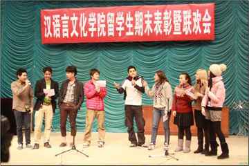 颁奖大会结束后,新年联欢会如期举行。各班的同学们都献上了自己精心准备的节目。初级一班的同学演唱的《茉莉花》和《童话》将现场带进了音乐的海洋。由中级二班同学带来的小话剧《非诚勿扰》结合当下最流行的电视节目,上演了一出“相亲大戏”,幽默的台词和精湛的演出引得观众们哈哈大笑。童话剧《熊猫的南开奇遇》讲述了一只“熊猫”来南开学习汉语的故事,故事的结尾还为汉院做起了“广告”,各位演员也借“熊猫之口”表达了对学员和各位老师的感谢。文化选修课的班级也为大家做了汇报演出,由中国民歌班带来的中国歌曲联唱以及京剧班的梁氏银等带来的京剧联唱《报灯名》更是赢得了在场观众的热烈掌声。整场联欢会在《相亲相爱一家人》的歌声中圆满结束,寓意着汉院是一个温暖的大家庭,在这里有来自世界各国的“家人”,他们互相帮助,共同进步。