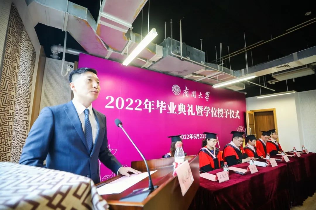 院长王立新教授代表学院向毕业生们表示热烈祝贺,寄语同学们“践行南开‘公能日新’的校训精神,肩负起你们这一代人的使命,开创更加辉煌灿烂的未来”。他对同学们提出三点期望:一是提升格局,在苦难中成长。人的高度,不仅来源于对各类知识认知持续不懈地涉猎吸收,更主要的是取决于人生历练和内心格局。二是坚持学习,永葆追求进步的动力。校园只是学习的场所之一,而不是唯一。希望同学们永葆对知识与真理的渴望,做一个日新月异的人。三是勇于实践,做到知行合一。互联网时代咨询发达,提意见者众而实干者少,希望同学们做仰望星空、脚踏实地的实干家。