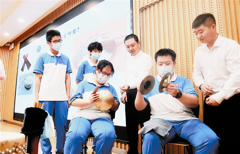 京剧传承基地的专家们走进天津中学,为师生们带来一场体验式艺术讲座《神奇的京剧打击乐》。