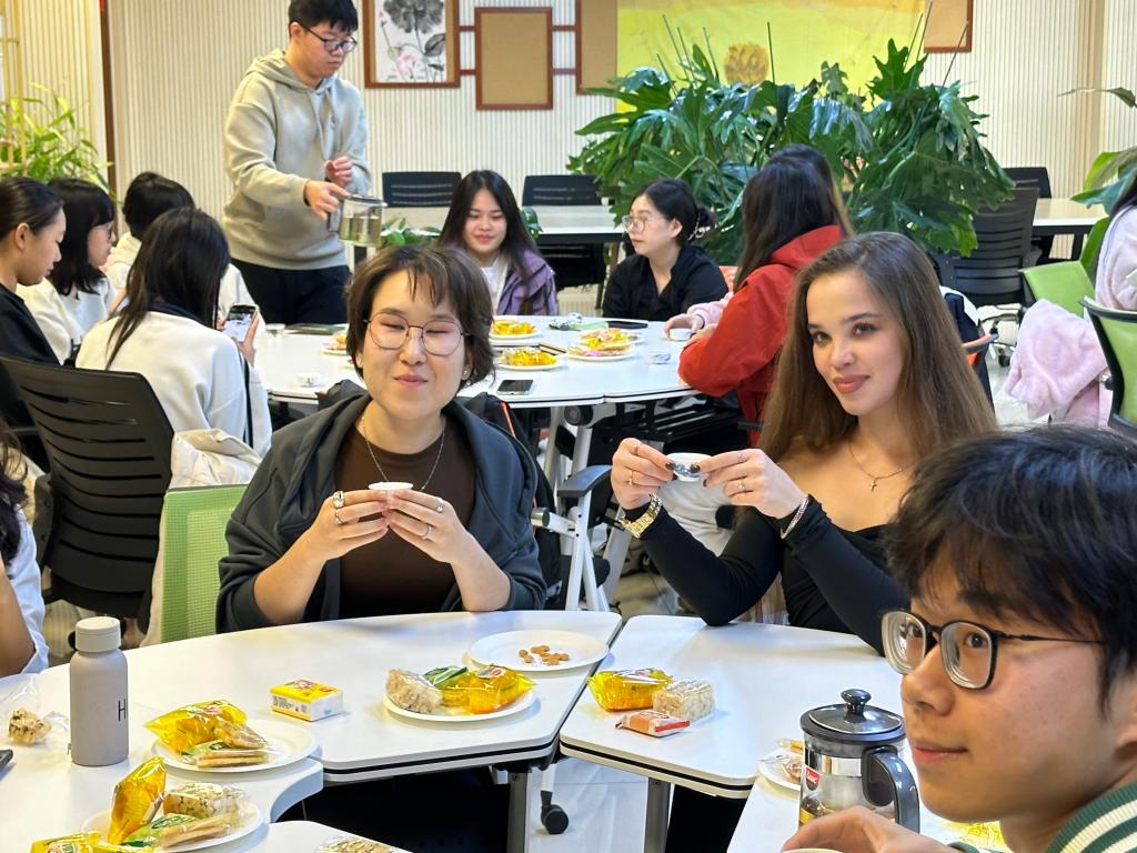 除了体验环节外,本次活动还专门安排了品茗环节,中外学生在现场纷纷品尝到了白茶、红茶、绿茶、乌龙茶六类不同的茶汤,沉浸式感受到了茶韵的悠扬,茶香的回甘。来自俄罗斯的留学生天蓝玉表示:茶叶在与水的融合下,茶香四溢,让我切身感受到了中国茶文化的独特魅力。这次活动让我了解了中国茶的历史和知识,体验到了茶文化的博大精神,让我以后对学习汉语和了解中华传统文化更加感兴趣。”