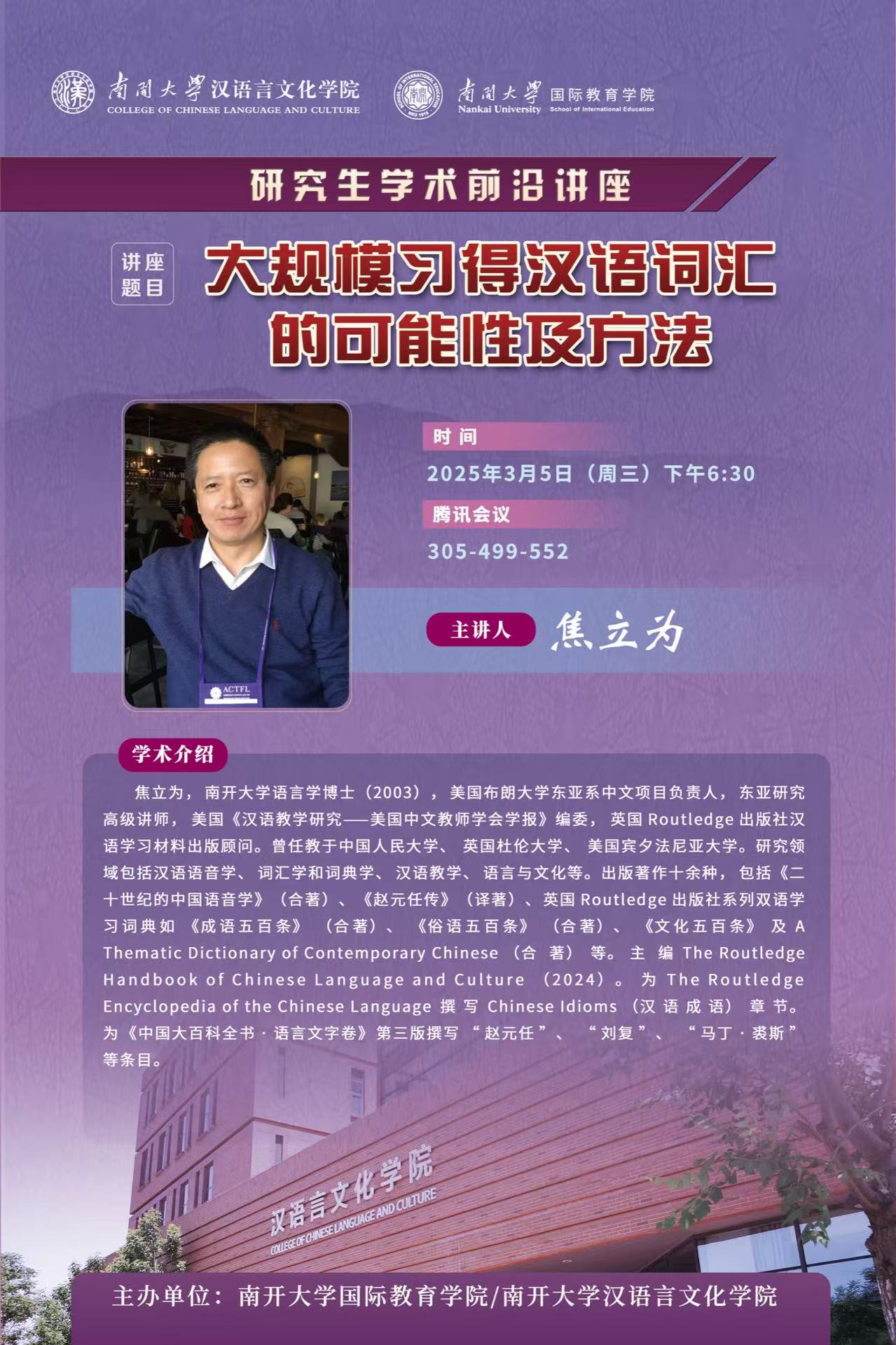 主办的研究生学术前沿讲座致力于为师生搭建高水平的学术交流平台,推动学术水平与汉语教育的创新与发展。同学们纷纷表示,本次系列讲座给大家带来了丰富的收获。焦立为老师近期还将带来一场高水平讲座,敬请各位关注。