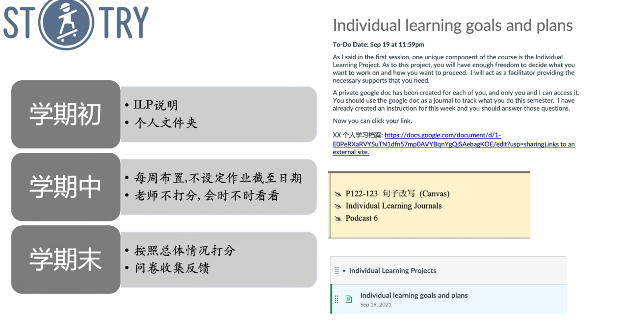 讲座第二部分,史中琦老师从应用性的角度出发,分享了自我决定理论,该理论认为人的基本心理需求包括胜任感、联系和自主性。满足其中任何一个需求,都能够增强学生的学习动机。在此基础上,史老师以自己教授高级商务中文课程的经历为例,详细介绍了他在课程中设置个性化学习项目(ILP)的实践过程。史老师通过让学生自主选择学习内容、自己设定目标,并在学期末根据学生的表现进行综合评分,满足了学生的自主性需求,增强了学生的学习动力。