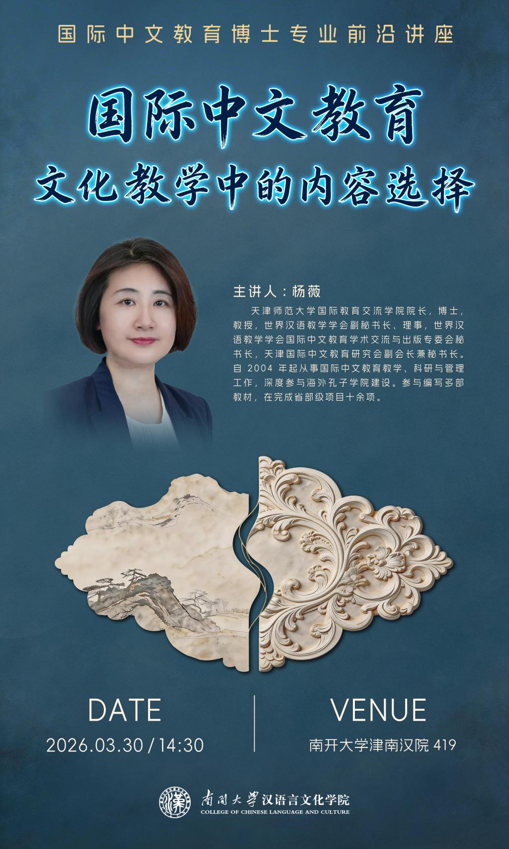 “国际中文教育博士专业前沿讲座”第二讲开讲。天津师范大学国际教育交流学院院长,教授,世界汉语教学学会副秘书长杨薇应邀作题为“国际中文教育:国际中文教育文化教学中的内容选择”的专题讲座。讲座由老司机论坛